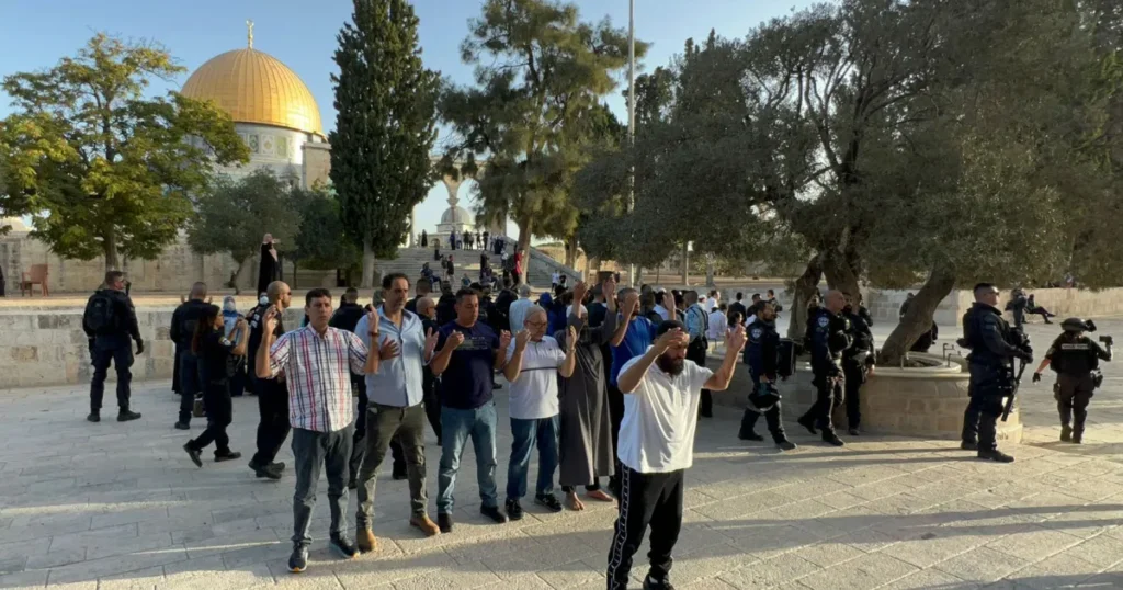 وأدى المستوطنون صلواتهم في الأقصى، وشكلوا حلقات الرقص والغناء بشكل جماعي، كما قاموا بالنفخ بالبوق في المسجد، بحراسة قوات الاحتلال.