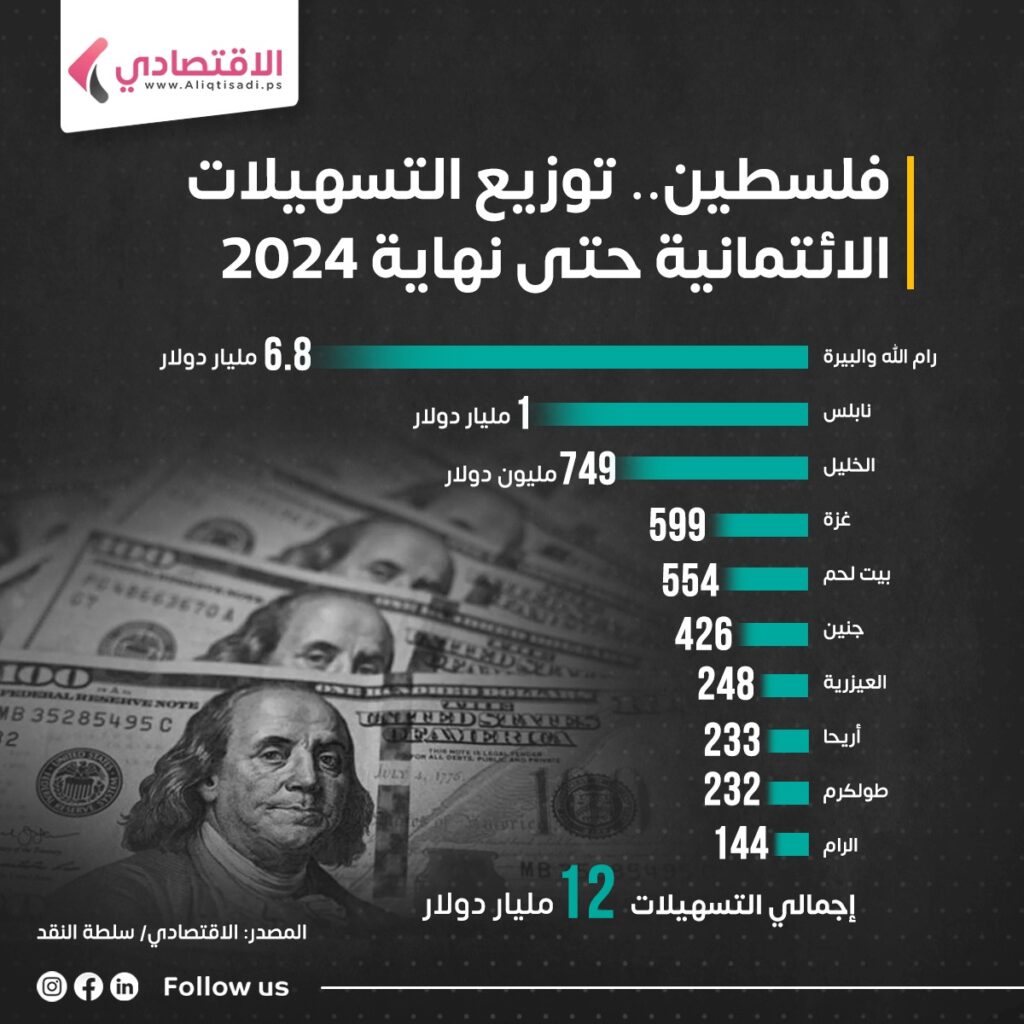 ووصل إجمالي القروض والتسهيلات المقدمة من البنوك العاملة في القطاع المصرفي في فلسطين حتى نهاية 2024 قرابة 12 مليار دولار منها 10 مليارات دولار في الضفة و2 مليار دولار في غزة.