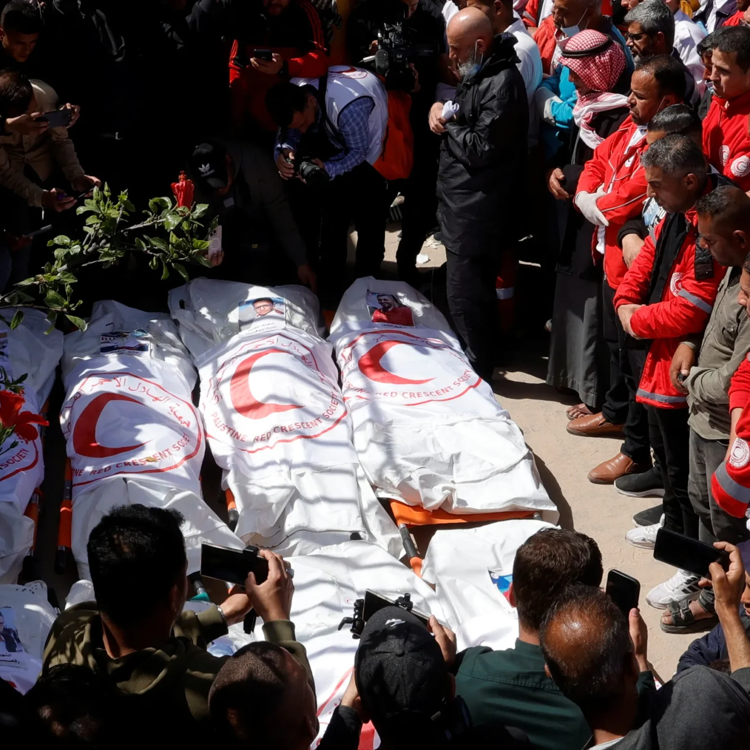والأحد الماضي، انتشلت جمعية الهلال الأحمر الفلسطيني، 14 جثمانا بعد قصف إسرائيلي في مدينة رفح، بينهم 8 من طواقمها و5 من الدفاع المدني وموظف يتبع لوكالة أممية.