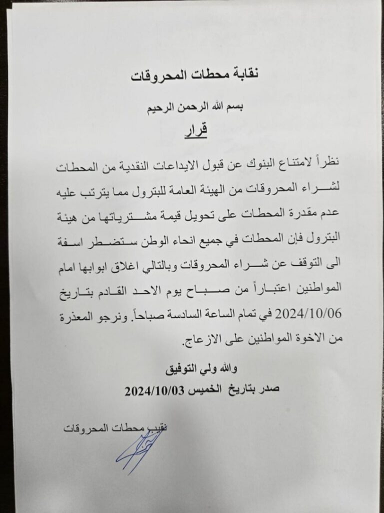 وبينت النقابة أن ذلك يأتي نظرا لامتناع البنوك عن قبول الايداعات النقدية لشراء المحروقات من الهيئة العامة للبترول، ما يترتب عليه عدم مقدرة المحطات على تحويل قيمة مشترياتها من هيئة البترول.