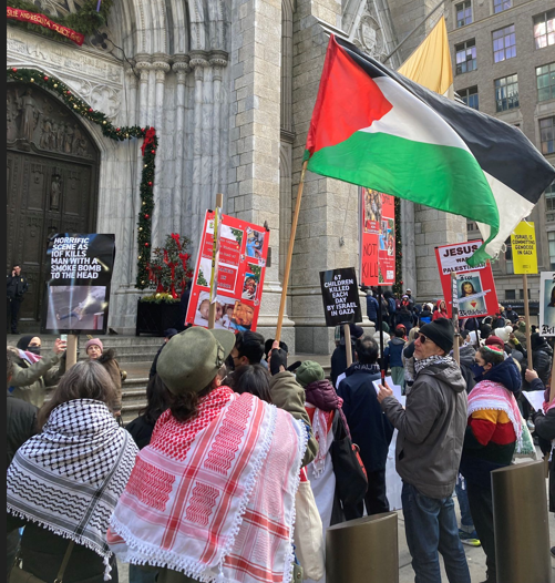تجمع المئات من النشطاء أمام كاتدرائية “القديس باتريك” في حي مانهاتن بولاية نيويورك، أثناء قداس عيد الميلاد المجيد، للاحتجاج على “الابادة الجماعية” المستمرة في قطاع غزة، والدعم الأميركي لدولة الاحتلال، والذي مكنّها من مواصلة الحرب الاجرامية بحق الشعب الفلسطيني.