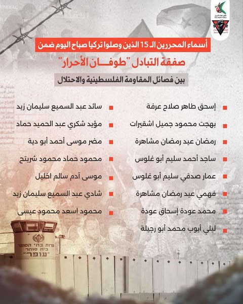 افاد مكتب إعلام الأسرى بوصول صباح اليوم 15 أسيرًا فلسطينيًا محررًا إلى تركيا ضمن صفقة التبادل “طوفان الأحرار” بين فصائل المقاومة والاحتلال.