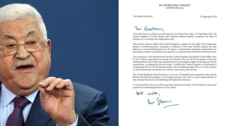 يشرفني أن أبلغكم وأضع على السجل أن المملكة المتحدة لبريطانيا العظمى وأيرلندا الشمالية تعترف ابتداءً من اليوم، 21 سبتمبر 2025، رسميًا بدولة فلسطين كدولة ذات سيادة ومستقلة.