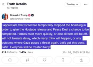 وكتب ترمب على منصة تروب سوشيال التي يمتلكها «أقدّر أن إسرائيل أوقفت القصف مؤقتًا لإتاحة فرصة لإتمام عملية إطلاق سراح الرهائن واتفاق السلام. على حماس التحرك بسرعة، وإلا ستُصبح كل الاحتمالات واردة».