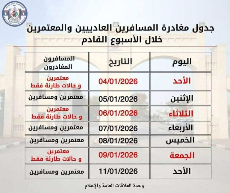 وقالت في بيان لها اليوم الثلاثاء، إنه تقرر تخصيص أيام 4 و6 و9 كانون الثاني/يناير 2026 لسفر المعتمرين المغادرين فقط، إضافة إلى الحالات الطارئة والإنسانية من المسافرين العاديين، وذلك نظراً للكثافة الكبيرة في أعداد المعتمرين خلال هذه الأيام.