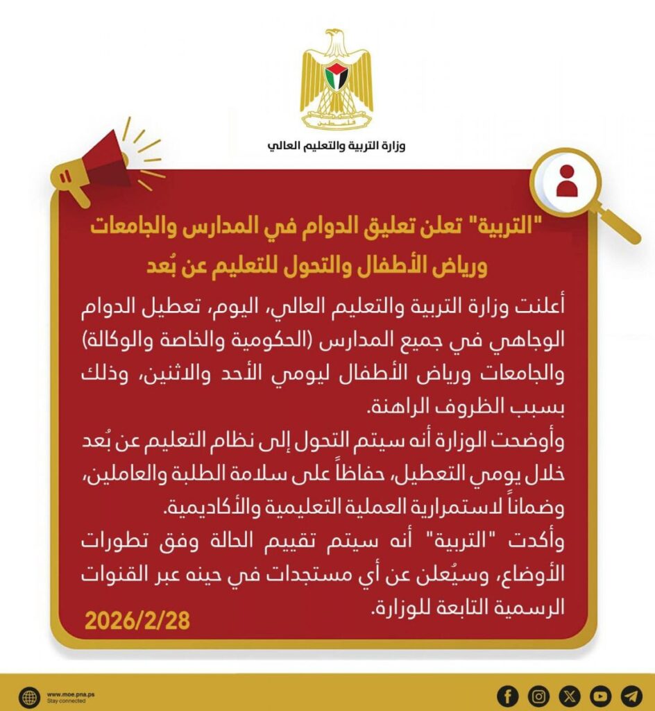 وأكدت “التربية” أنه سيتم تقييم الحالة وفق تطورات الأوضاع، وسيُعلن عن أي مستجدات في حينه عبر القنوات الرسمية التابعة للوزارة.