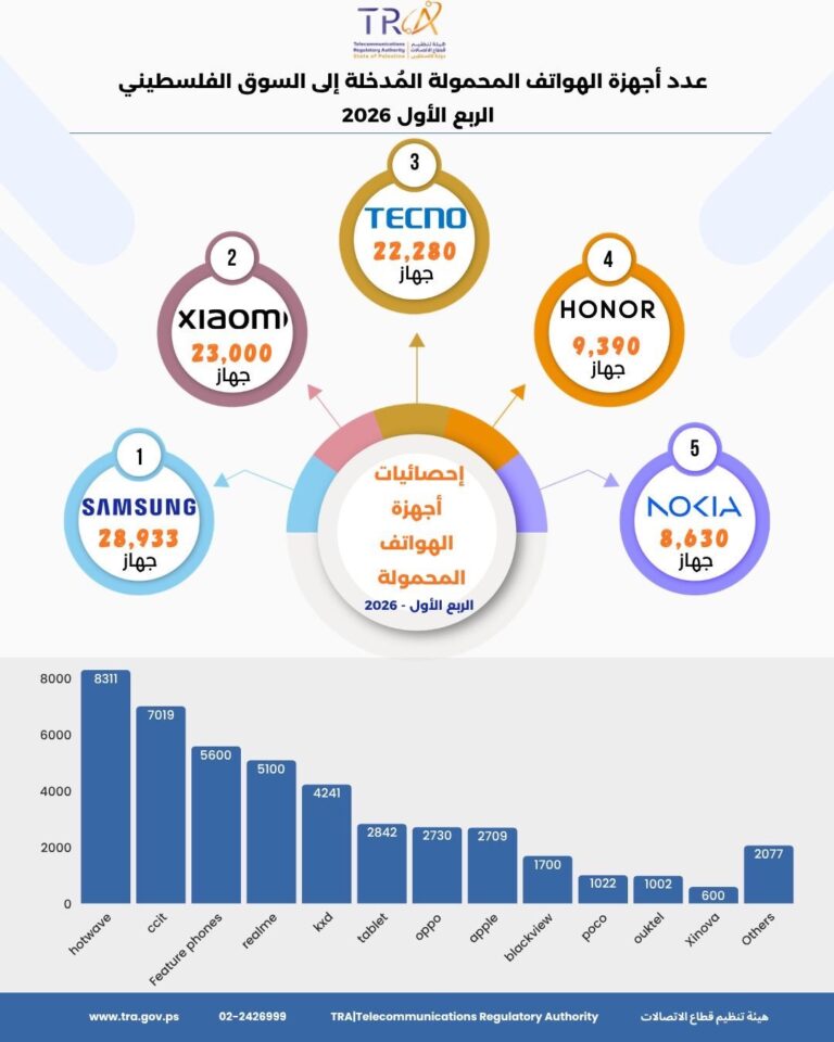 رام الله – أعلنت هيئة تنظيم قطاع الاتصالات عن مؤشرات سوق الأجهزة الخلوية في فلسطين للربع الأول من عام 2026، حيث أظهرت البيانات أن إجمالي عدد أجهزة الهواتف المحمولة المُدخلة إلى السوق الفلسطيني بلغ (137,186) جهازاً، توزعت على عدد من العلامات التجارية العالمية.